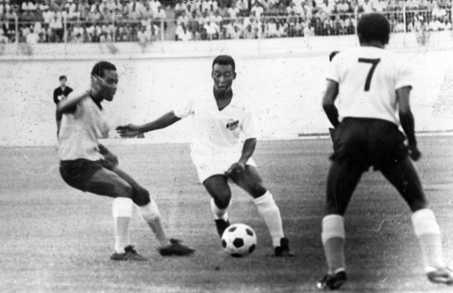 Pele (centre), wrong-foots Cavalier's Joshua Hamilton with a deft feint and is about to carry the ball past Neville Oxford (no. 7) during the January 31, 1971 football game between Santos of Brazil and the Cavalier Invitational side at the National Stadium.