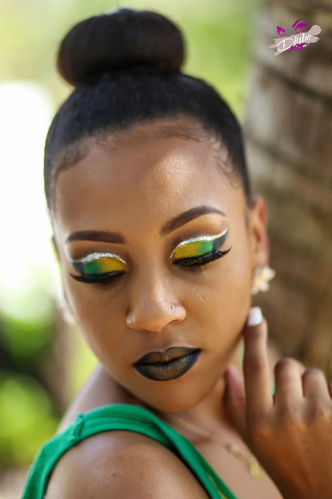 There would be no reggae with Jamaica, so inspired by our national flag, Diabo puts palette to face with black, green and gold. To give it a nice twist, she created a glitter cut crease and finished it off with bold lips to give it that strong and seductive look.