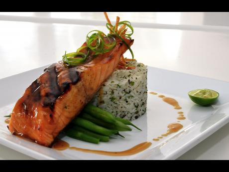 Succulent grilled salmon garnished with escallion resting on a bed of stringbeans and rice.