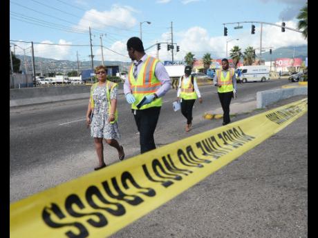 The incident brought traffic to a crawl yesterday as sections of Portia Simpson Miller Square were cordoned off to allow processing of the scene.