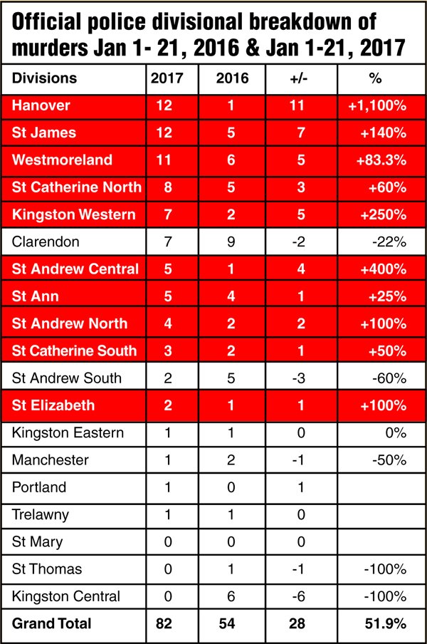 Having ended 2016 with the worst per-capita murder rate in Jamaica, the parishes of Hanover, St James and Westmoreland have started 2017 in the same vein, accounting for 43 per cent of the 82 murders committed across the island in the first 21 days of this year.