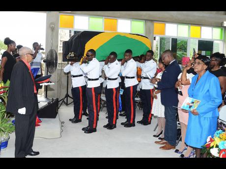 Police pall-bearers carry the coffin with the remains of retired Detective Sergeant Trevor Earl Williams into the Naggo Head Church of God of Prophecy in Portmore, St Catherine, for a thansgiving service last Saturday.