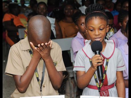 Thrisianna Coke hugs spell mate Dante Ruddock, both of New Horizon Preparatory in Westmoreland, minutes before Thrisianna emerged parish champion.