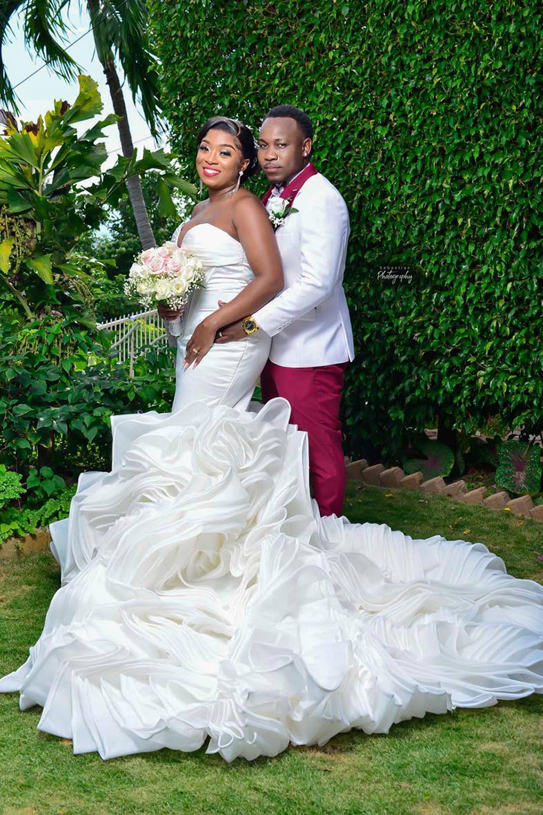 November 6, 2021, on their 12th anniversary, Tavia and O’Shane joined in holy matrimony to become the Huies. City View Hotel in Smokey Vale, St Andrew, provided the romantic backdrop for the highly anticipated nuptials. The stunning bride headed up the aisle in a breathtaking ivory mermaid gown with a plunging sweetheart neckline and ruffled finish from LuxBrides Ja. Her handsome groom received his bride with open arms and an open heart.