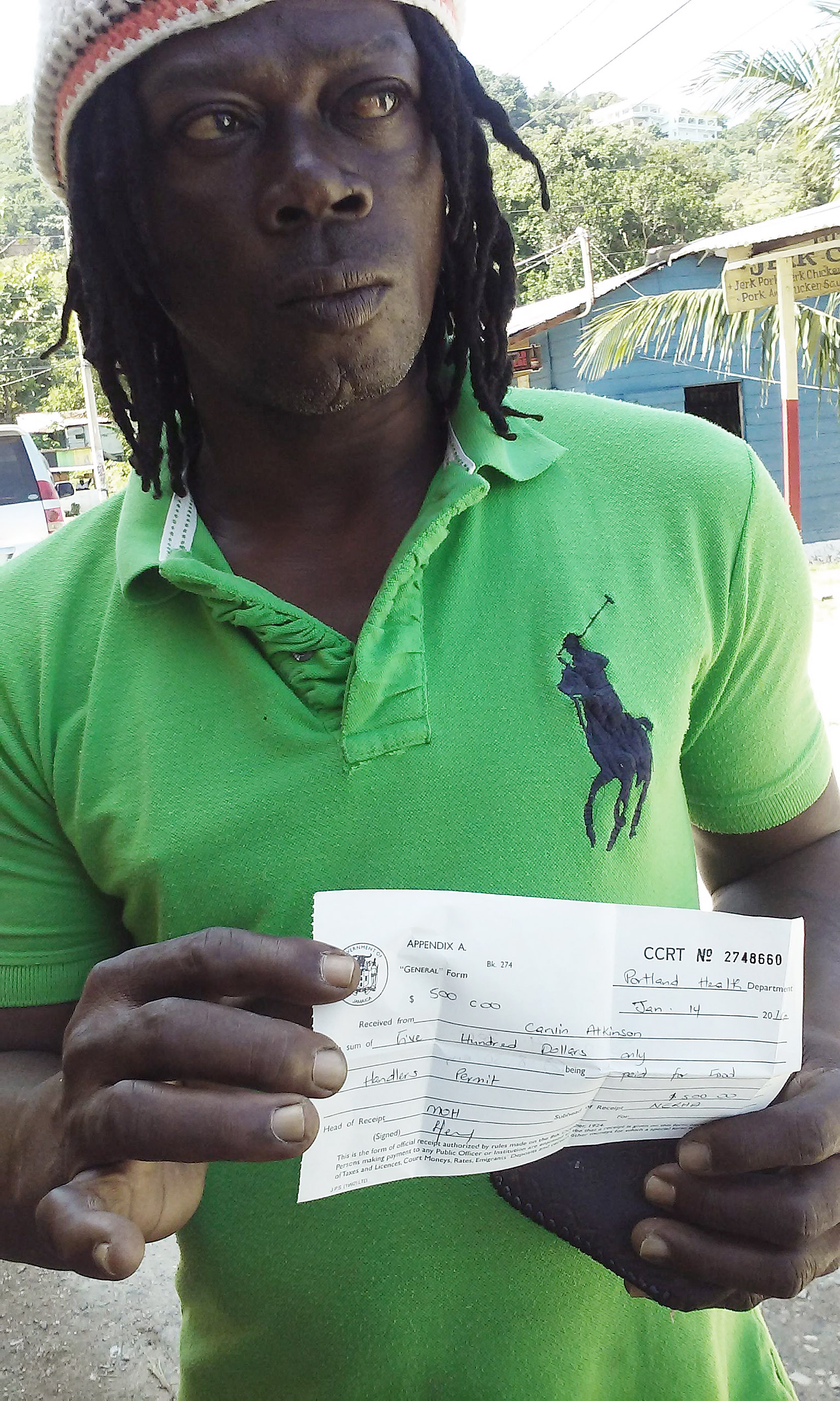 Jerk vendor Carven Anderson displaying his food handler’s permit receipt.