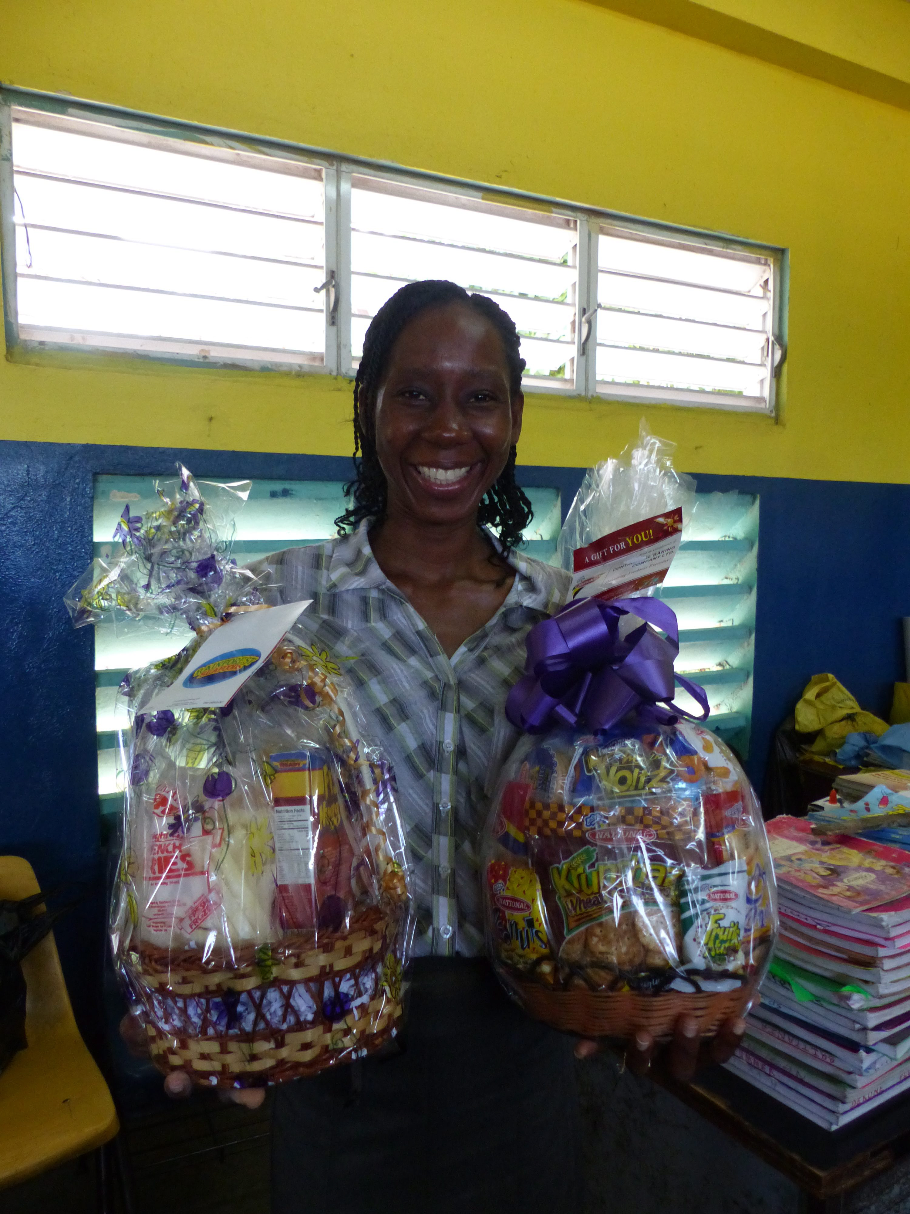 One of the 32 teachers at Iris Gelly Primary smiles radiantly, having been presented with her Rainforest Seafoods and National Bakery Teachers’ Day baskets.