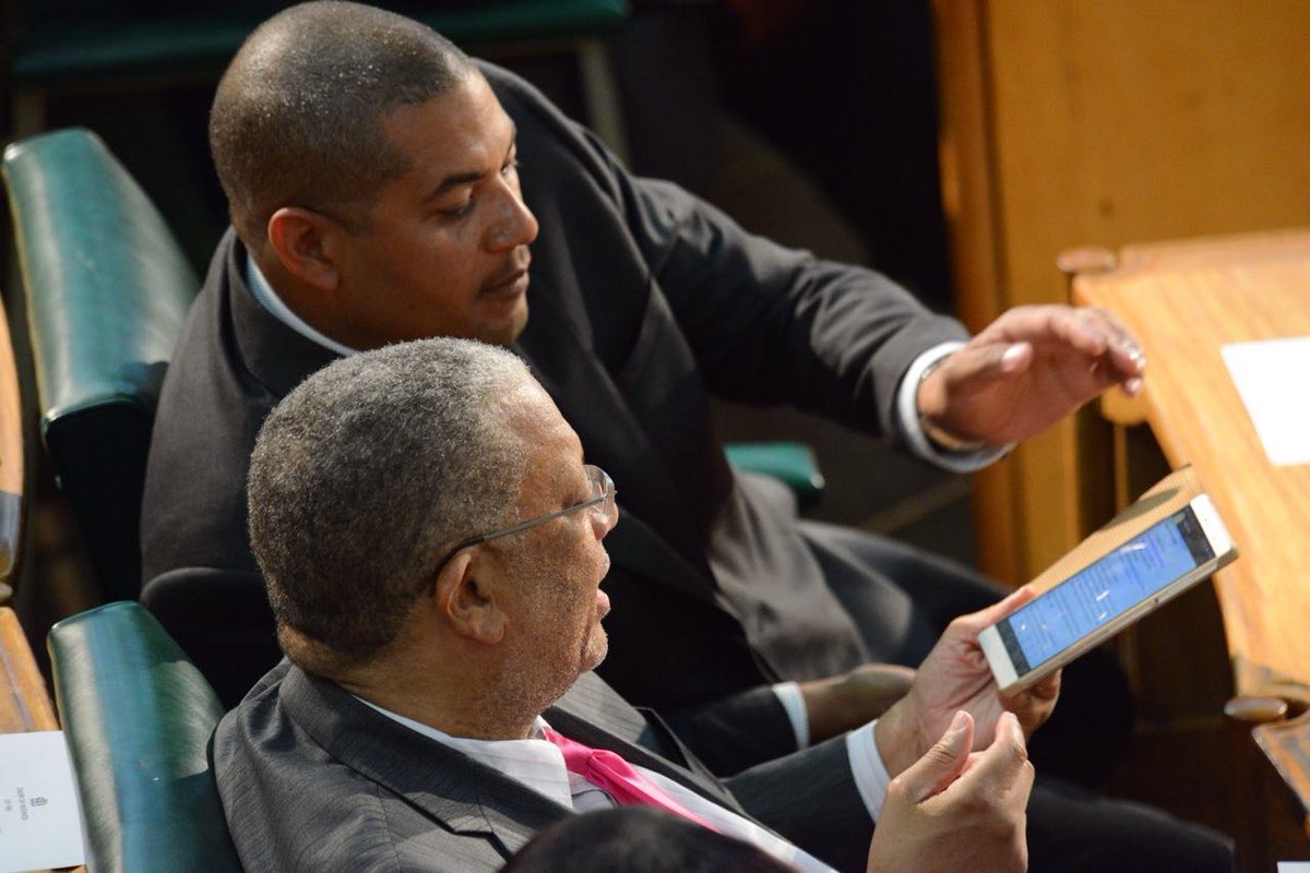 IN PHOTO: Finance Minister Dr Peter Phillips and his son Mikael Phillips in Parliament