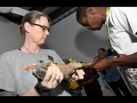 Melanie Litton (left), Audubon Zoo assistant curator of herpetology, and Garnett Bartley of the National Environment and Planning Agency screen an iguana during the Annual Jamaican Iguana Health Screening Exercise held earlier this month at the Hope Zoo in St Andrew.