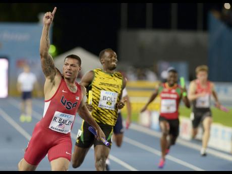 Ryan Bailey, minutes before admitting that Bolt running by him on the anchor leg at the 2012 Olympic Games was carved in his memory, held off the big Jamaican this time after taking the baton a few healthy strides ahead. And his somewhat controversial celebration - Bolt's 'To di Worl' pose, amended with a finger dragged across the neck in 'cut-throat' fashion, as well as the fist bumps and chest beating that followed among the US quartet - showed how big a deal it was.
