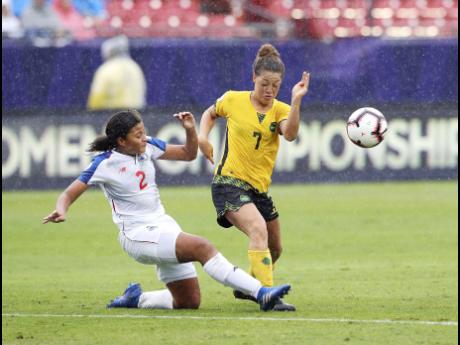 Panama defender Hilary Jean (left) makes a tackle on Jamaican midfielder Chinyelu Asher during the first half of the third-place match of the Concacaf women's World Cup qualifying tournament, on Wednesday. Jamaica won 4-2 on penalties after a 2-2 scoreline to book a spot to next year's FIFA Women's World Cup.