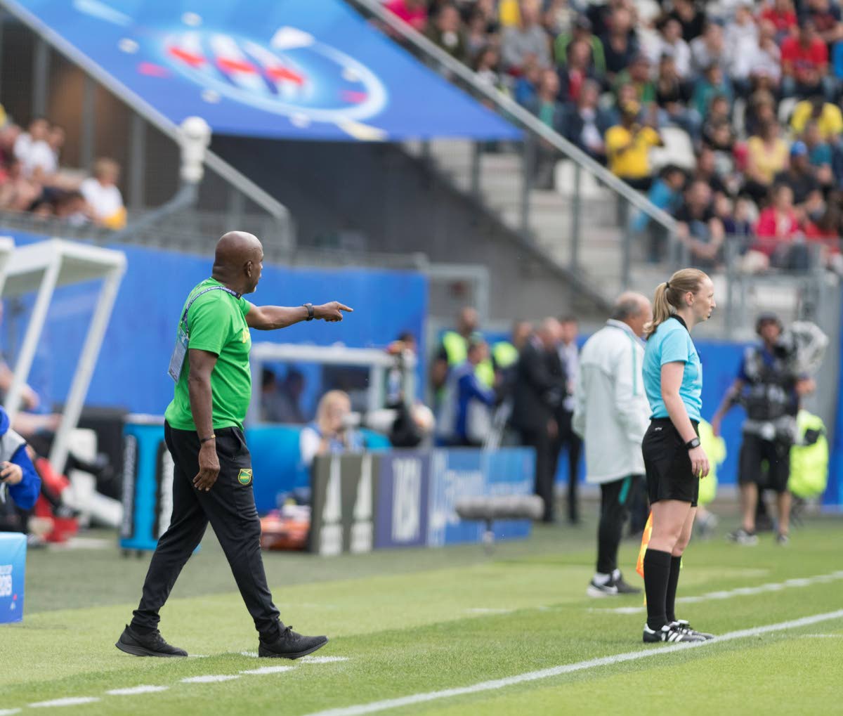 National senior women's football team assistant coach Lorne Donaldson, gives instructions to the Reggae Girlz, from the touchline, during their FIFA Women's World Cup Group C game against Brazil at the Stade des Alpes on Sunday. Gladstone Taylor/Multimedia Photo Editor