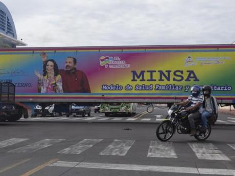 In this June 17, 2021 file photo, a billboard promoting President Daniel Ortega and his wife and Vice President Rosario Murillo covers a truck driving through Managua, Nicaragua. The US State Department announced Monday, July 12, 2021, it is revoking the travel visas of 100 legislators, judges, and prosecutors who aided the regime of President Daniel Ortega. (AP Photo/Miguel Andres, File)