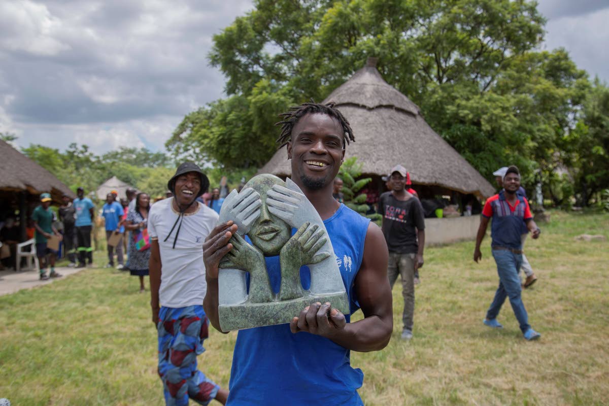 Gift Mutsauni holds his winning sculpture that will be part of an upcoming exhibition at Oxford University, aiming to contextualise the legacy of British imperialist Cecil John Rhodes at the Chitungwiza Arts Center near Harare, Zimbabwe.
