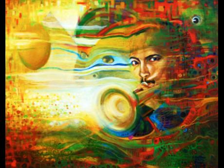 Hutton, a lecturer in political philosophy and culture at UWI, Mona, said that in 'Don Cosmic', Drummond's riveting stare "has to do with his inner self/creative spirit and the impact his music had on me as a boy, not yet 10 years old. I still feel that way about Don Drummond's music, that haunting, sad, lonely, joyful sound which I, as a boy, related it to the spirit world stories that I grew up on. The painting is trying to depict the articulation of Drummond's inner self, his obeah, linking it to historical/ancestral metaphysicality and creativity. The robin red breast, for example, is deemed in Jamaican cosmology as the presence of an ancestor. The pyramid represents the pinnacle of a historical benchmark in human evolution, as well as a metaphor for Don's creative cosmic musical climb. The fish denotes Riva Muma, Oshun, etc. (which is) ancestral god of fresh water. The egg is a symbol of uncertainty and, in an aesthetic sense, a muse of spontaneity".