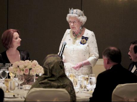 Britain's Queen Elizabeth II (second left) delivers a speech as Australian Prime Minister Julia Gillard (left) looks on during a banquet dinner as part of the Commonwealth Heads of Government Meeting (CHOGM) in Perth, Australia, yesterday. The British monarch's first-born child, whether a girl or a boy, will ascend the throne under new succession rules approved Friday by Commonwealth nations, reversing centuries of tradition. (AP Photo/Ron D'Raine, Pool)