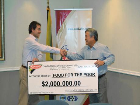 Chairman of one of the registered charities locally, Food For The Poor (FFP) Jamaica, Andrew Mahfood (left), accepting a J$2 million donation from chairman of the Continental Baking Company Limited, Gary Hendrickson.- File